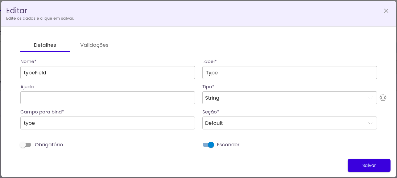 ), ao lado direito da configuração de Tipo do campo. Após configurar, acione o botão Salvar.