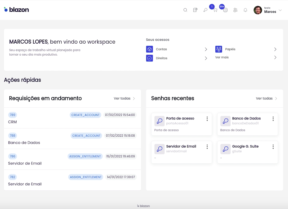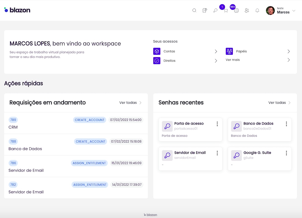 O Painel Principal oferece atalhos para que você facilmente alcance as funcionalidades por meio das quais pretende desempenhar suas atividades. Em geral, essas atividades são relativas a solicitação de acessos, troca de senha, alteração de informações pessoais e cofre de senha.