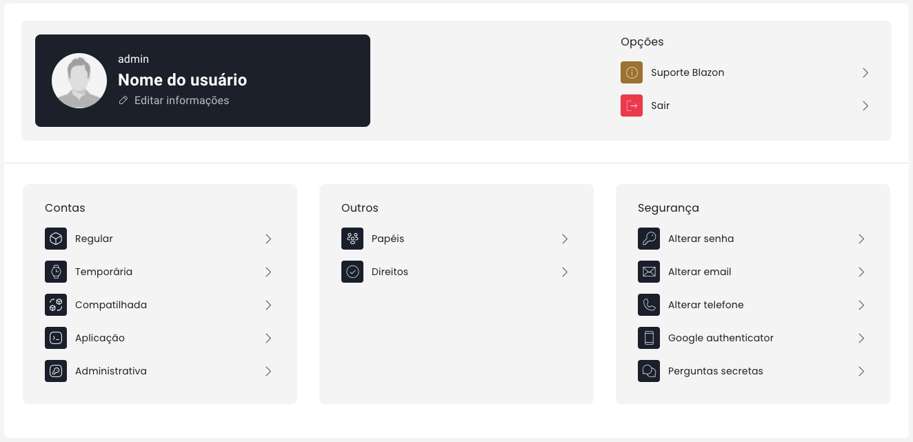 Contas e Outros: aqui você tem uma relação de tipos de contas que possui, tais como, contas regulares, temporárias, compartilhadas, administrativas, papéis e direitos;