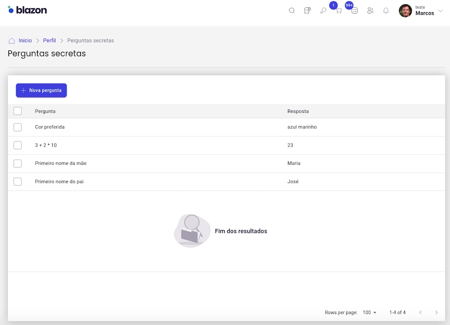 Dentre outros fatores, o Blazon permite que você configure perguntas secretas pessoais como forma de efetuar sua troca de senha e se autenticar.