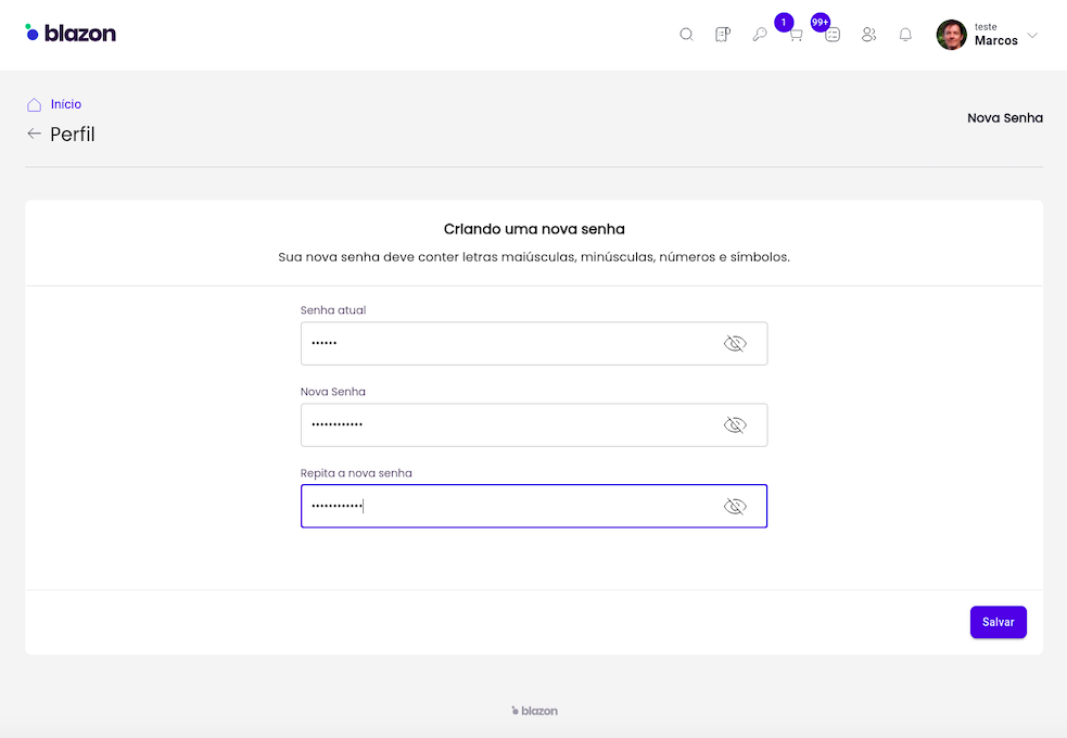 Para alterar a senha, você deve informar sua senha atual e sua nova senha. Após confirmar os dados, basta clicar no botão salvar.