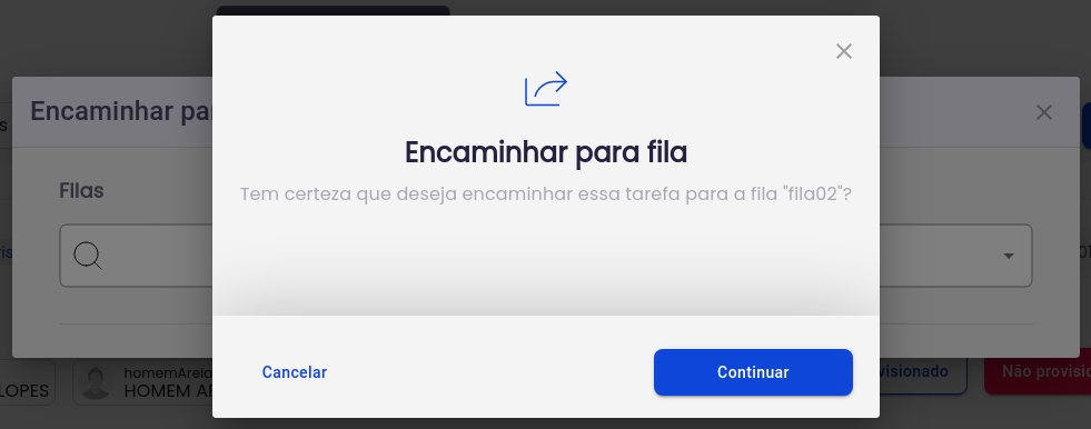 Acionando o botão "Continuar" a tarefa será imediatamente encaminhada para a fila selecionada e não será mais vista na sua lista de tarefas "aguardando resolução".