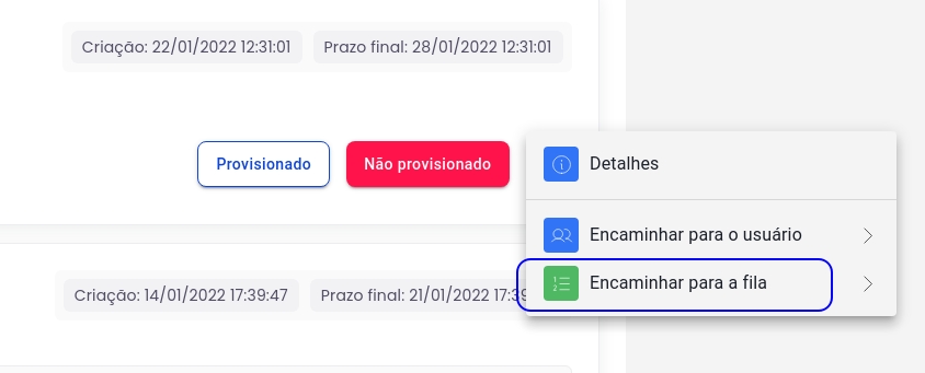 A partir do submenu de ações comuns das tarefas, você pode encaminhar uma tarefa para uma fila clicando na ação "Encaminhar para a fila", como ilustrado na figura a seguir: