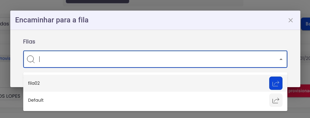 Selecionando a opção “Encaminhar para a fila” uma caixa de diálogo de busca e seleção de fila de tarefas é apresentada e basta você confirmar a fila desejada clicando no botão (