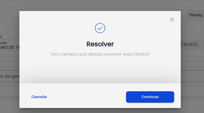 O clique no botão "Resolver" significa aprovação dos direitos ao papel (mcados) respectivo da tarefa, no entanto ainda necessita de confirmação. A figura abaixo, ilustra essa interação com o usuário: