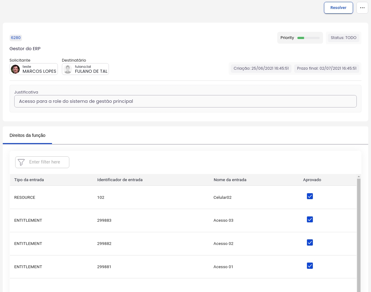 A resolução da tarefa de direito de papel é simples e pode ser feito à partir da tela de detalhamento com um clique no botão "Resolver" no canto superior direito da tela.