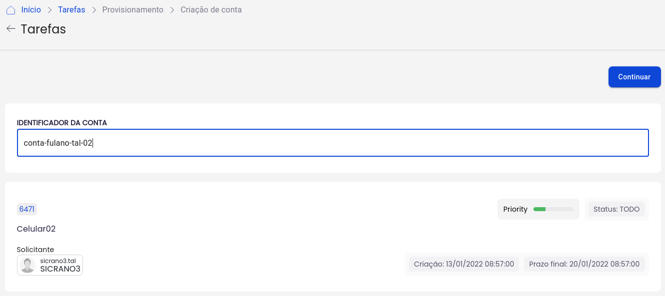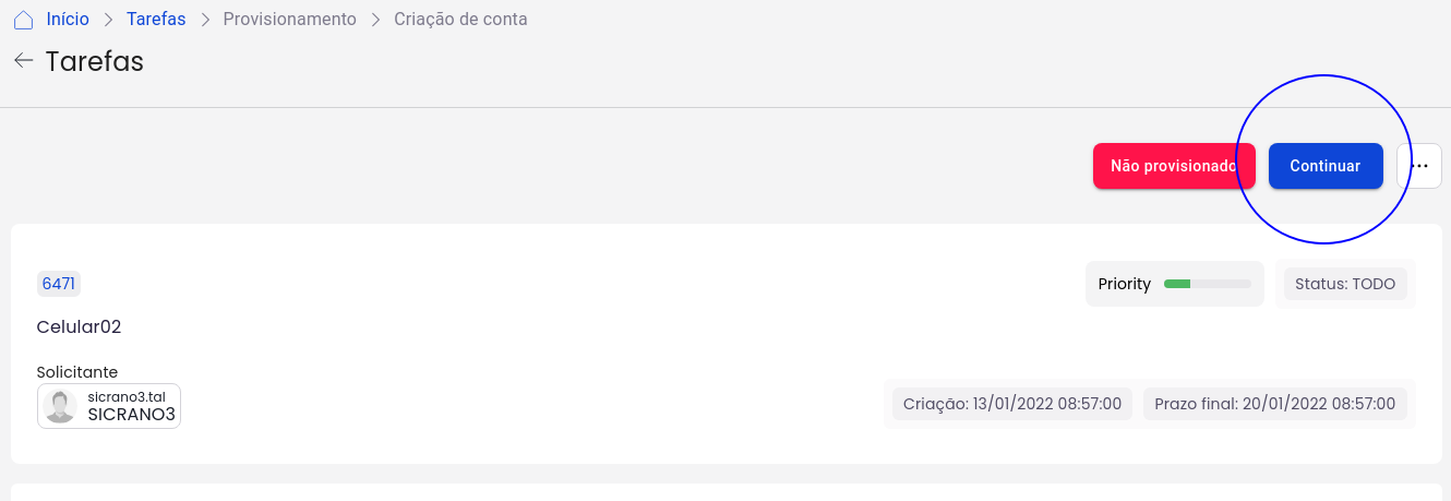 Nesses casos, para resolver a tarefa como provisionada, você deve entrar no detalhamento da tarefa e clicar no botão "Continuar", como ilustrado na figura a seguir: