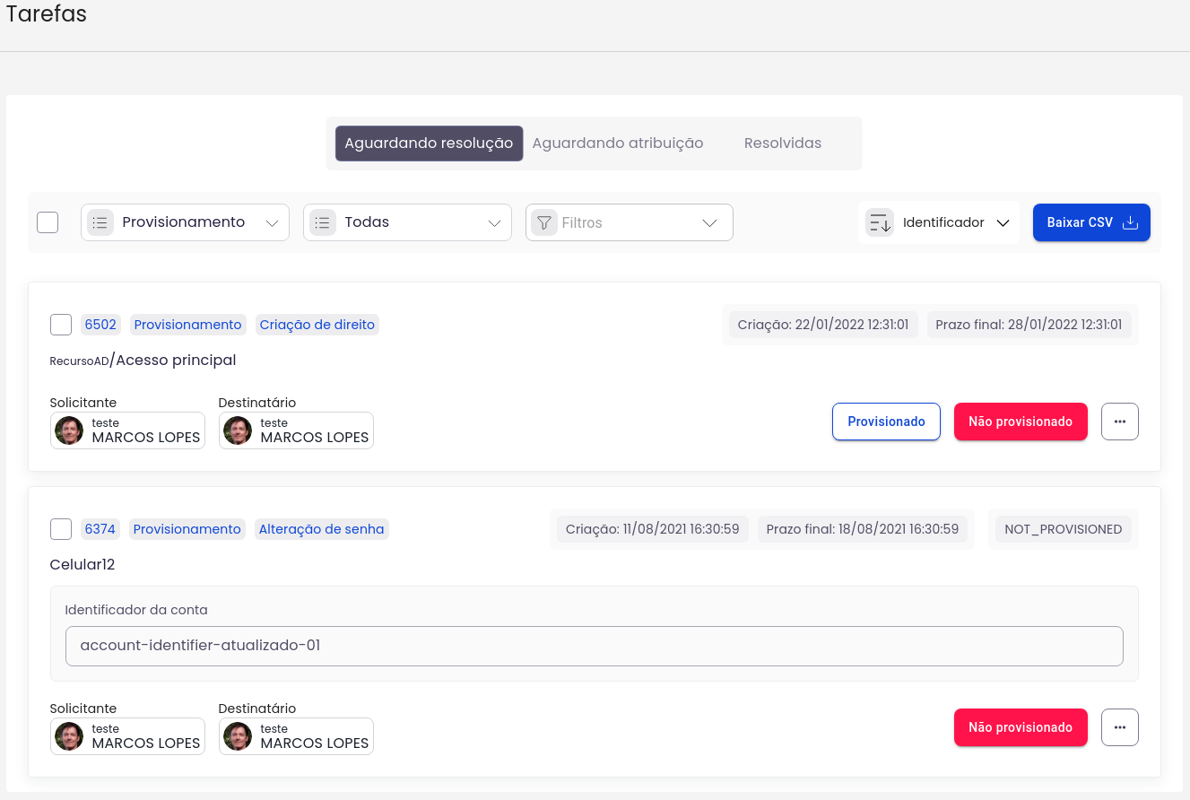 A resolução da tarefa de provisionamento é simples e pode ser feito à partir do card na listagem com um clique num dos dois botões "Provisionado" ou "Não provisionado" no canto inferior direito do card de cada tarefa de provisionamento.