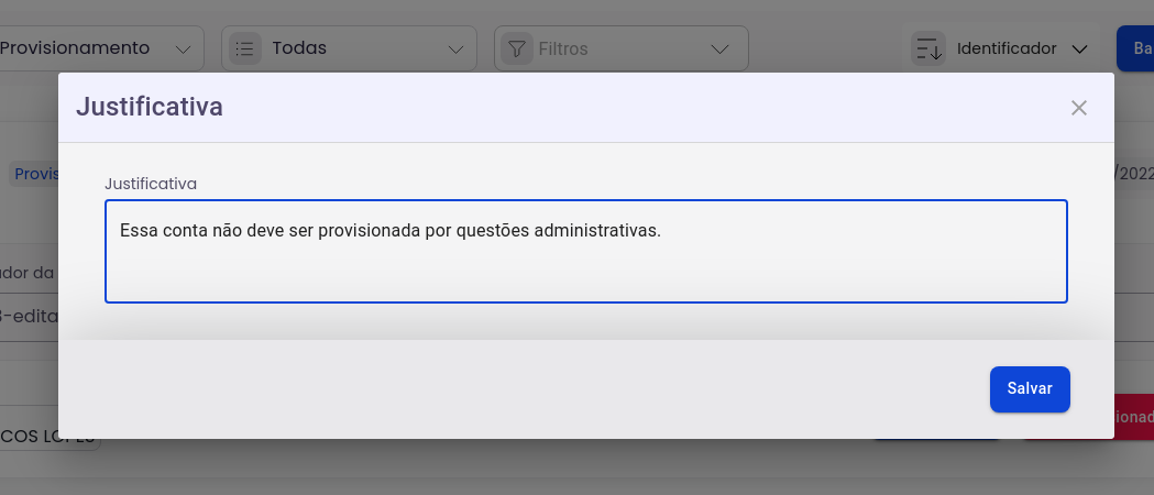 Caso a resolução seja de não provisionamento, uma caixa de diálogo é apresentada para a entrada de uma justificativa para o não provisionamento do acesso. A figura abaixo, ilustra essa interação com o usuário: