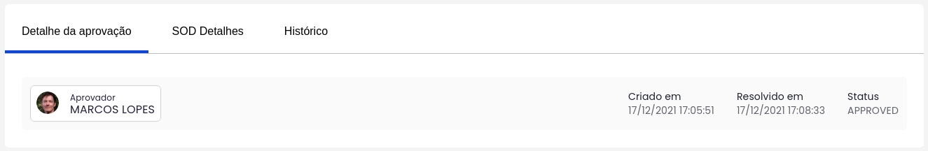 Além disso, na sua requisição é possível visualizar as aprovações pertinentes a segregação de responsabilidade. Esta aba mostra as informações de aprovação de segregação semelhantes a aba Detalhe da aprovação.